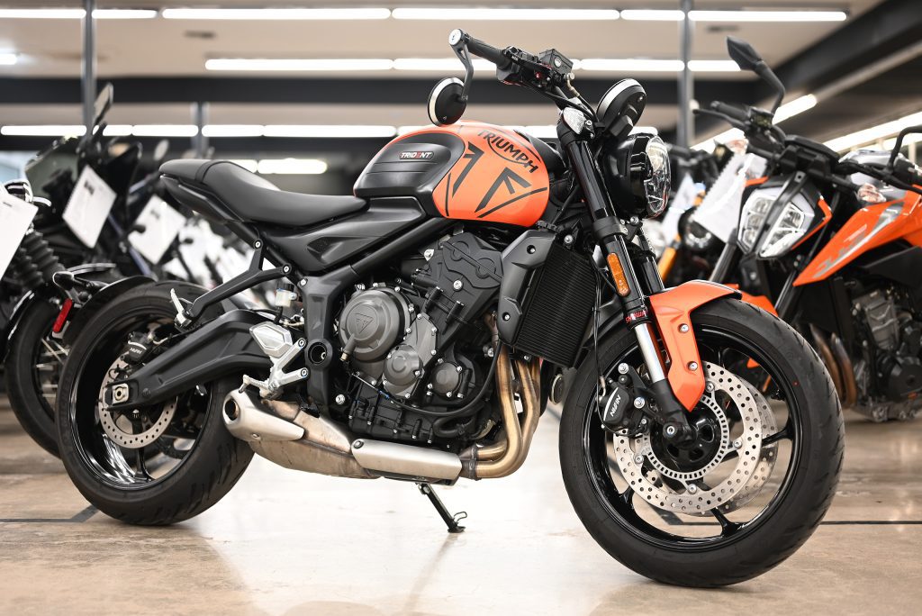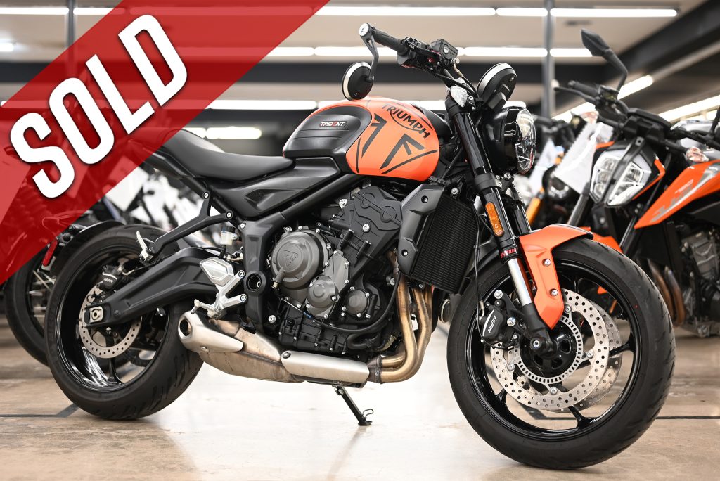 This one owner Trident is featured in orange and black livery with only three thousand miles.